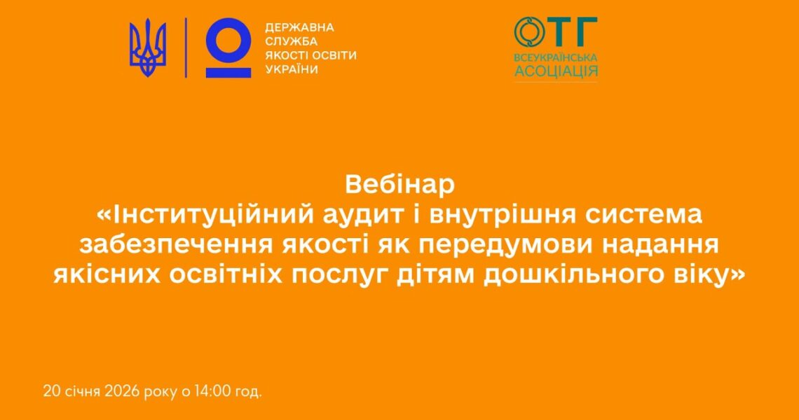 Вебінар «Інституційний аудит і внутрішня система забезпечення якості як передумови надання якісних освітніх послуг дітям дошкільного віку», організований спільно Державною службою якості освіти України та Всеукраїнською асоціацією органів місцевого самоврядування «Асоціація об’єднаних територіальних громад» (@ВсеукраїнськаАсоціаціяОТГ ).