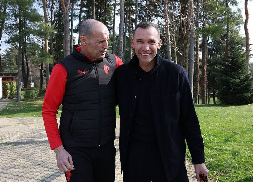 Під час нинішнього візиту на тренувальну базу клубу Шевченко провів бесіди з керманичем італійців Массіміліано Аллегрі, із спортдиром клубу Іглі Таре, а також привітав гравців своєї колишньої команди.